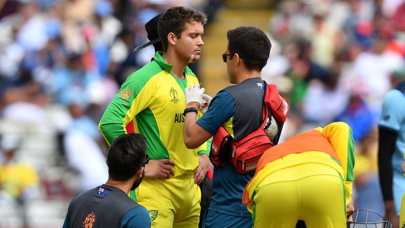 Australia’s wicketkeeper-batsman, Alex Carey was at the receiving end of a vicious Jofra Archer delivery, which knocked his helmet off before he started bleeding from his chin during the second semi-final of the ICC Cricket World Cup 2019 against England at Edgbaston.