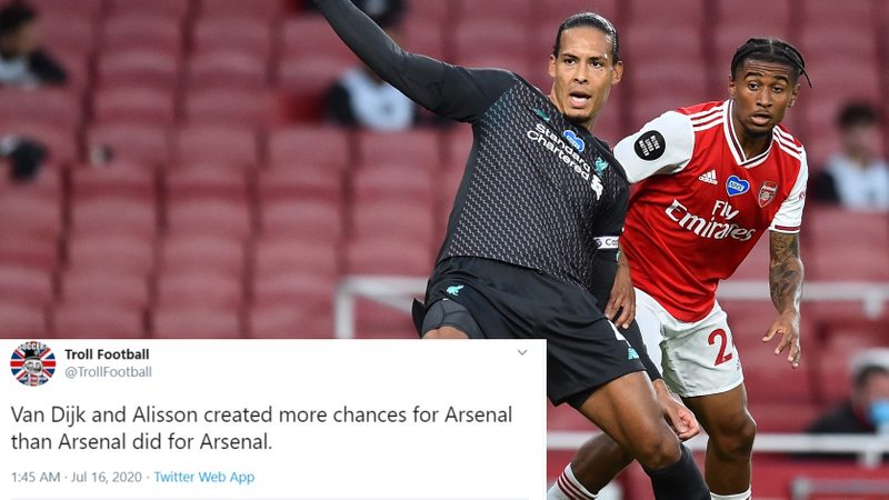 Arsenal held on to their gifted lead for the rest of the night, beating Liverpool and ending the Reds’ hopes of breaking Manchester City's record of 100 points in a Premier League season. The internet was unforgiving of Van Dijk and Alisson for their error and here are some of the best reactions:
